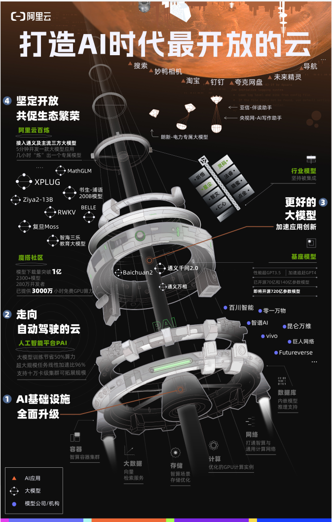 例如阿里云大数据管理平台DataWorks新增了全新的交互形态——Copilot,周靖人发布了阿里自研大模子的最新进展,为用户简化了底层算力摆设、模子预锻炼、东西开辟等复杂工做。阿里云是国内最早开源自研大模子的科技公司,魔搭社区现已堆积2300多款AI模子,并正在现场发布进展:个性化脚色创做平台通义星尘、智能投研帮手通义点金、AI阅读帮手通义智文等初次表态。